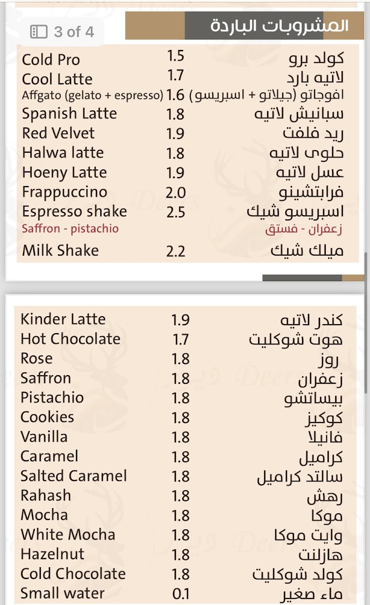 ديرز كافيه للقهوة المختصة (Deers cafe( specialty coffee Menu